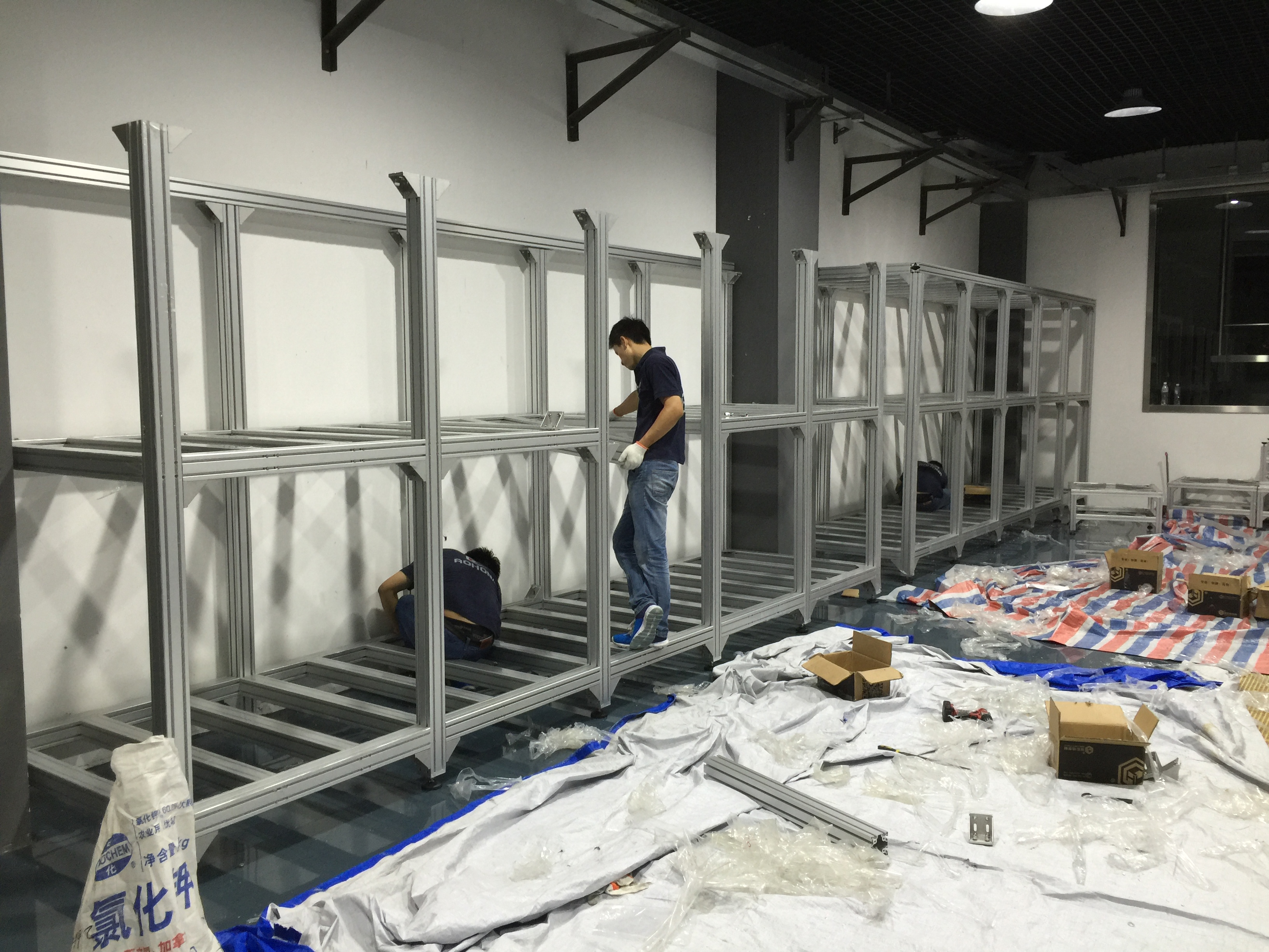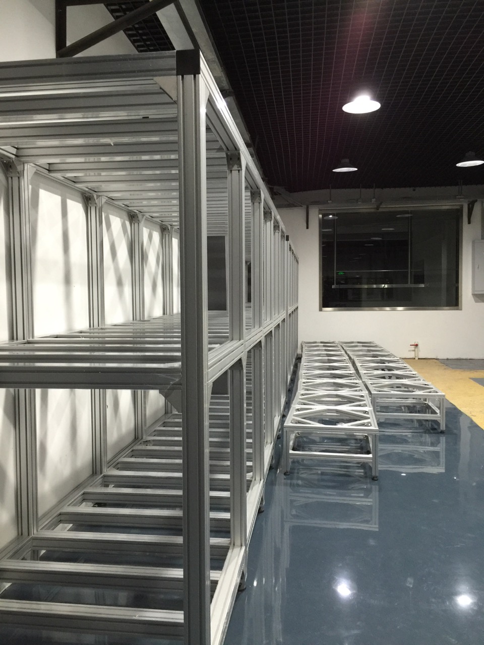了解朱經(jīng)理的項目需求后,我們立刻對朱經(jīng)理項目進行設(shè)計,朱經(jīng)理的項目施工在崇明中華鱘夢園,約有200平方的占面積,每個定制鋁型材框架,高3米,長15米的,承載力要達10噸,我們整個鋁框架的方案全部采用歐標80120鋁型材做立柱,8080鋁型材做橫梁,結(jié)構(gòu)連接采用12.9級高強度不銹鋼螺栓+打孔連接,并外面用直角件加固連接保確承重安全及結(jié)構(gòu)穩(wěn)定。工藝,是加工好后,現(xiàn)場施工。自方案設(shè)計到生產(chǎn)總15天,并在5天內(nèi)完成上門施工。