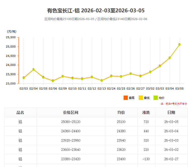 進(jìn)入2026年3月,國內(nèi)鋁錠價(jià)格迎來新一輪強(qiáng)勢(shì)上漲。根據(jù)長(zhǎng)江有色網(wǎng)最新數(shù)據(jù),3月5日鋁錠均價(jià)已飆升至25100元/噸,單日漲幅高達(dá)720元,創(chuàng)下近階段新高。這一劇烈波動(dòng)不僅牽動(dòng)著上游電解鋁企業(yè)的神經(jīng),更對(duì)下游工業(yè)鋁型材 加工行業(yè)帶來了嚴(yán)峻的成本考驗(yàn)。